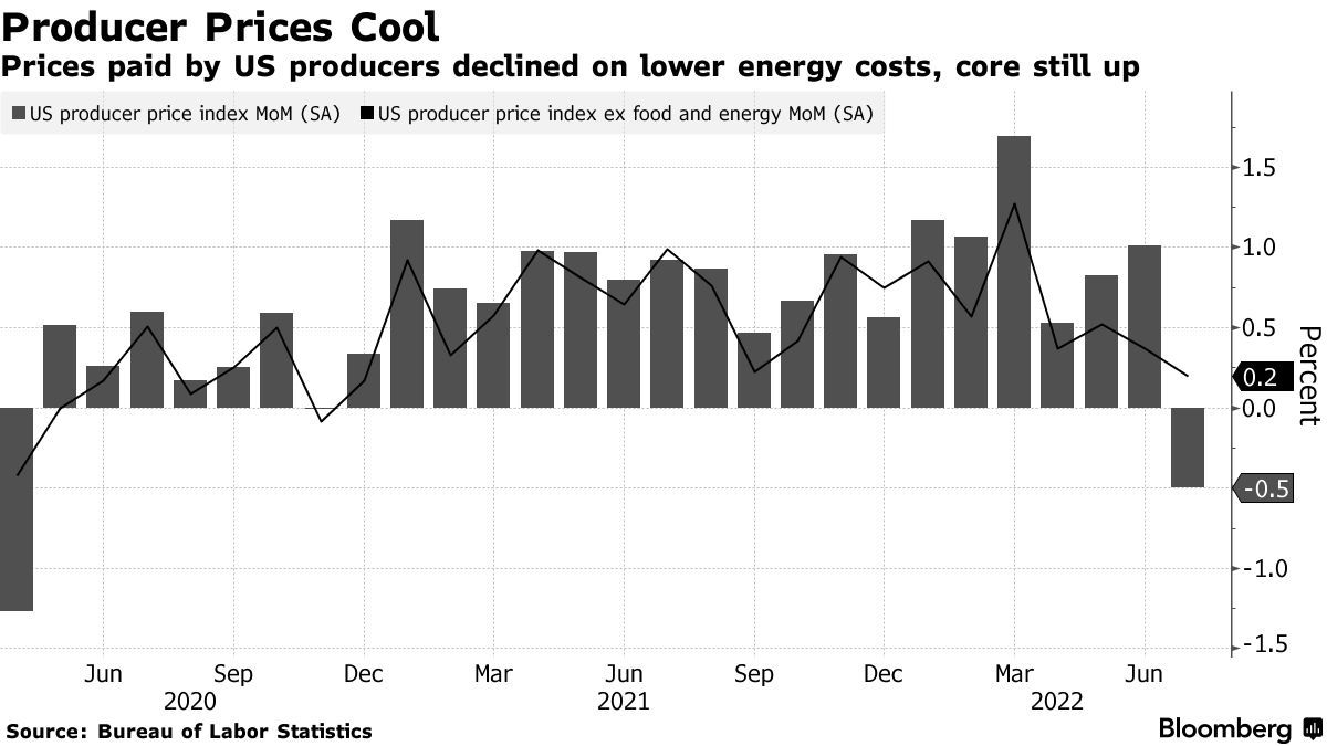 美国劳工局周四公布的最新数据显示,美国7月份生产者价格指数(PPI)出现两年多以来首次环比下降,主要原因是能源价格暴跌减缓了通胀步伐,并代表美国通胀压力出现适度的缓和。数据显示,美国7月生产者价格指数较6月下降0.5%,这是自2020年4月新冠疫情以来首次出现环比下降,经济学家普遍预计为环比增长0.2%。
